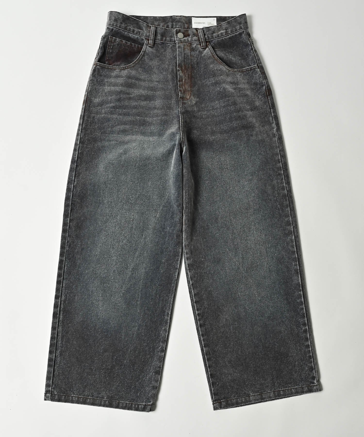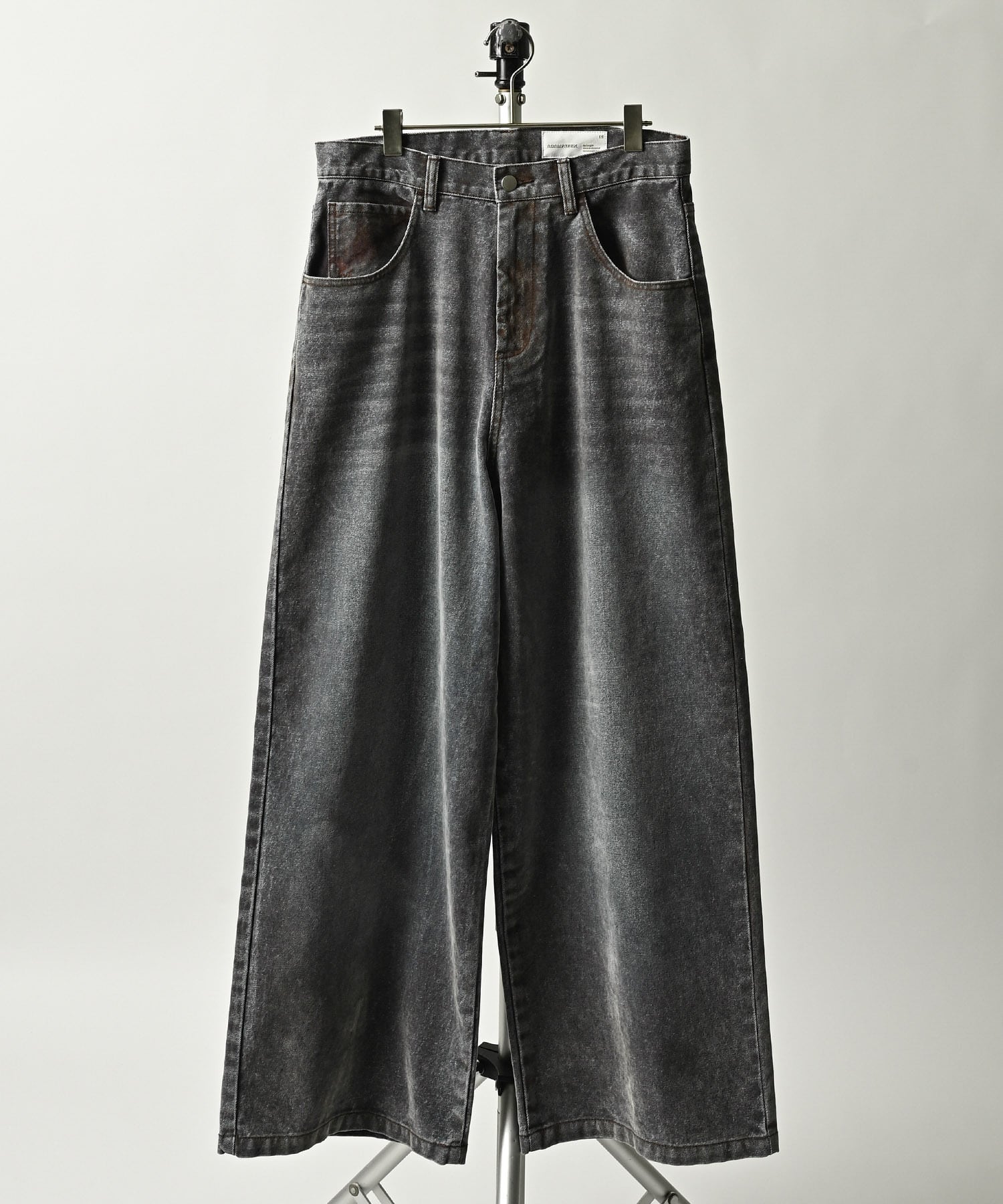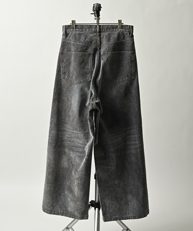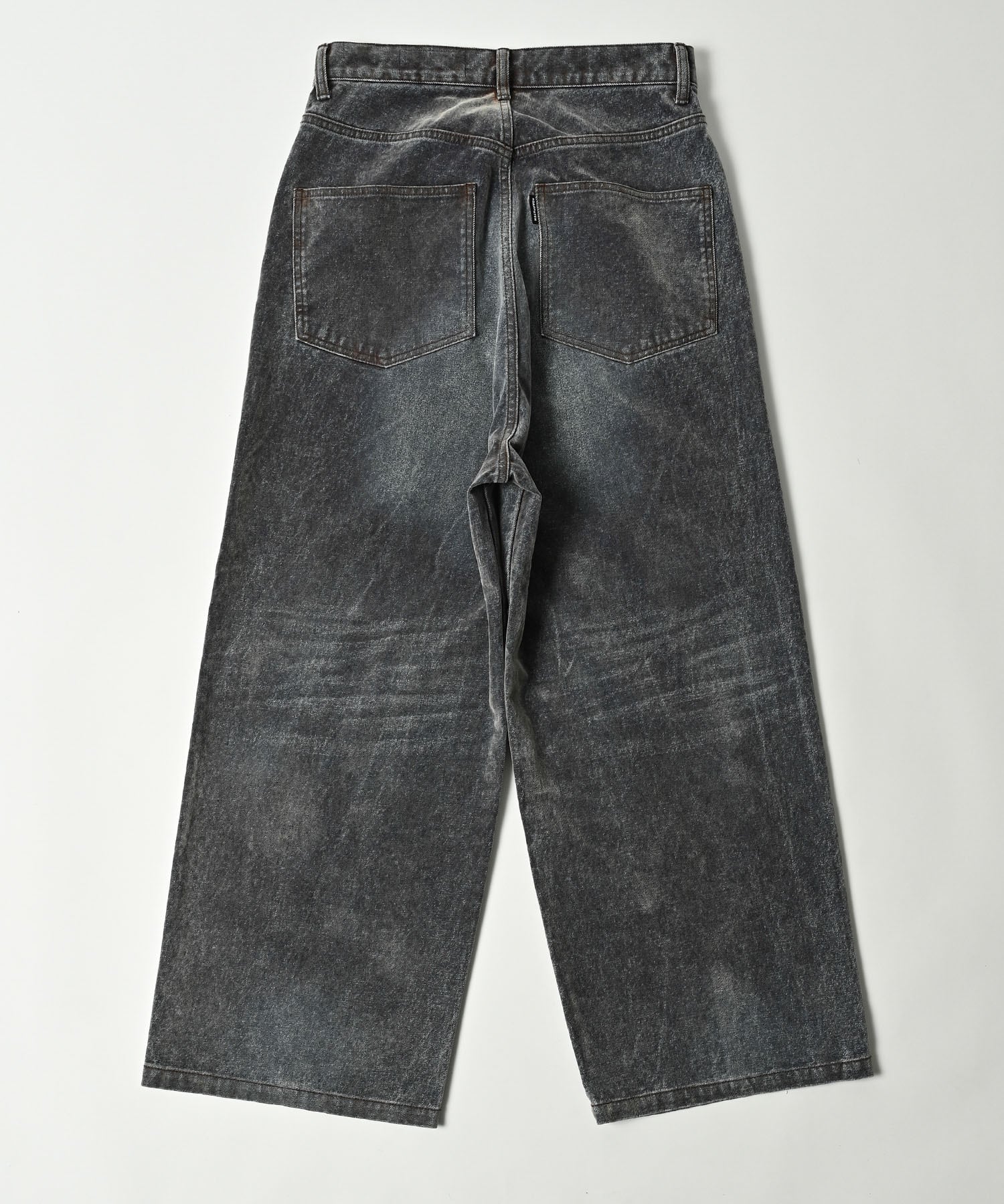 フロッキー加工を施したデニム素材を使用したパンツ。