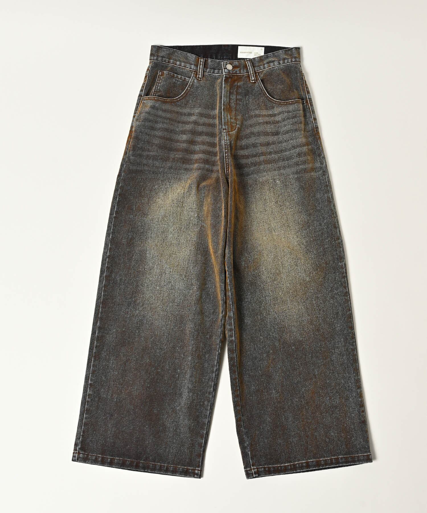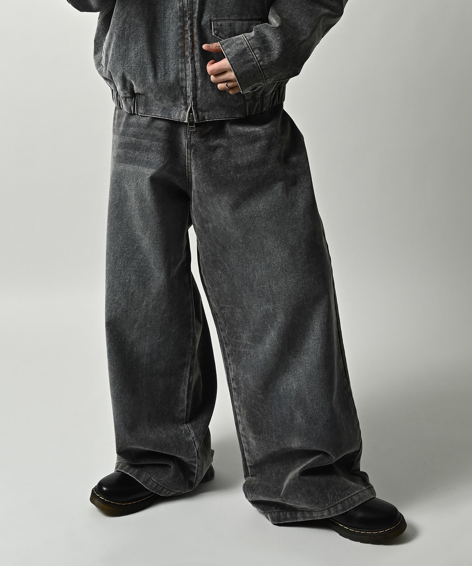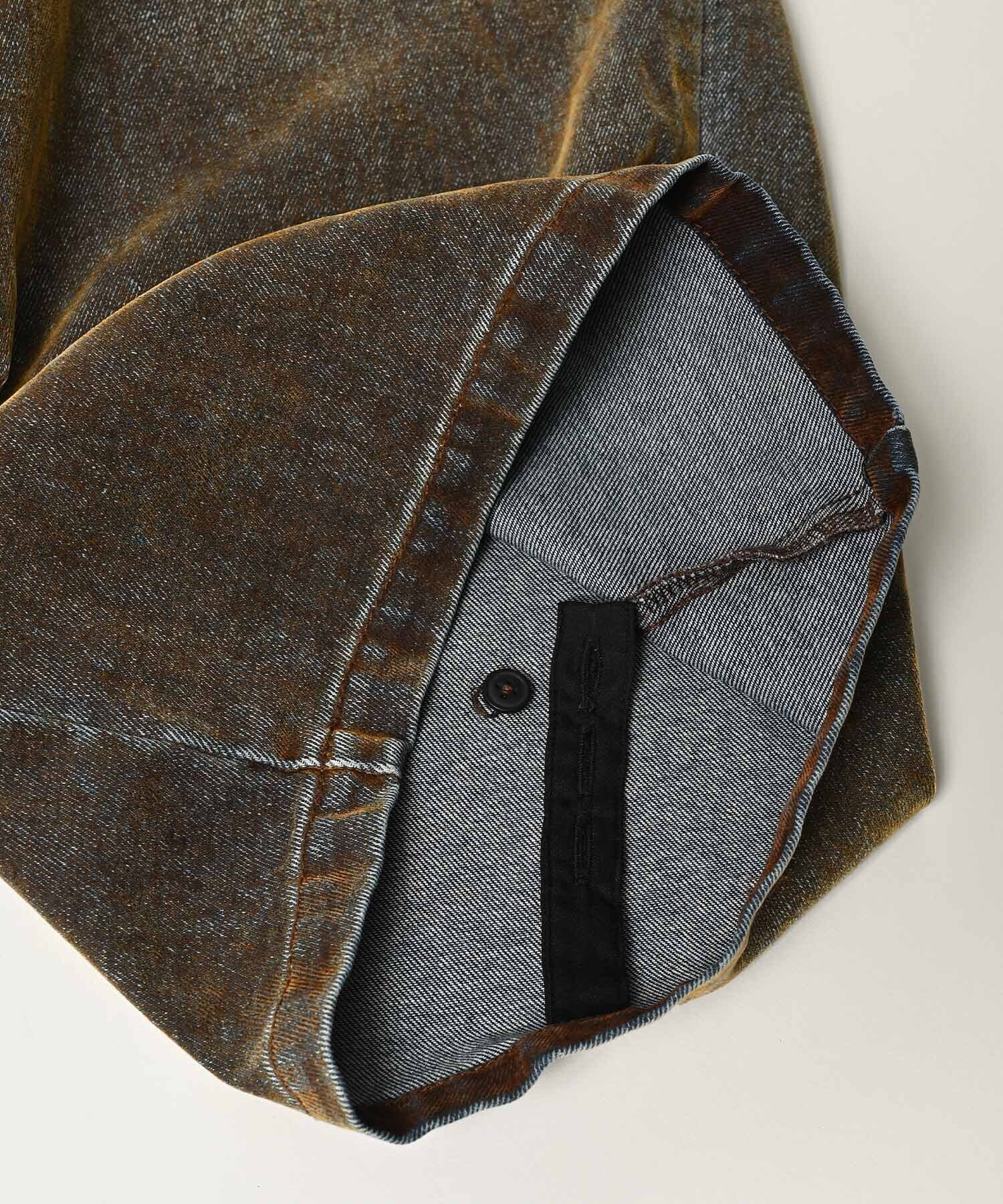 フロッキー加工を施したデニム素材を使用したパンツ。