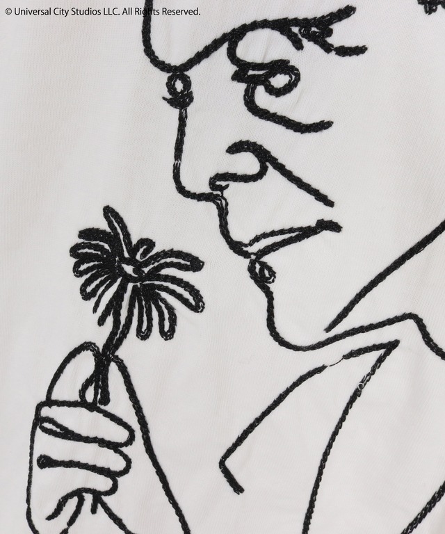 フランケンシュタインと花の対比的な線画をハンドステッチ