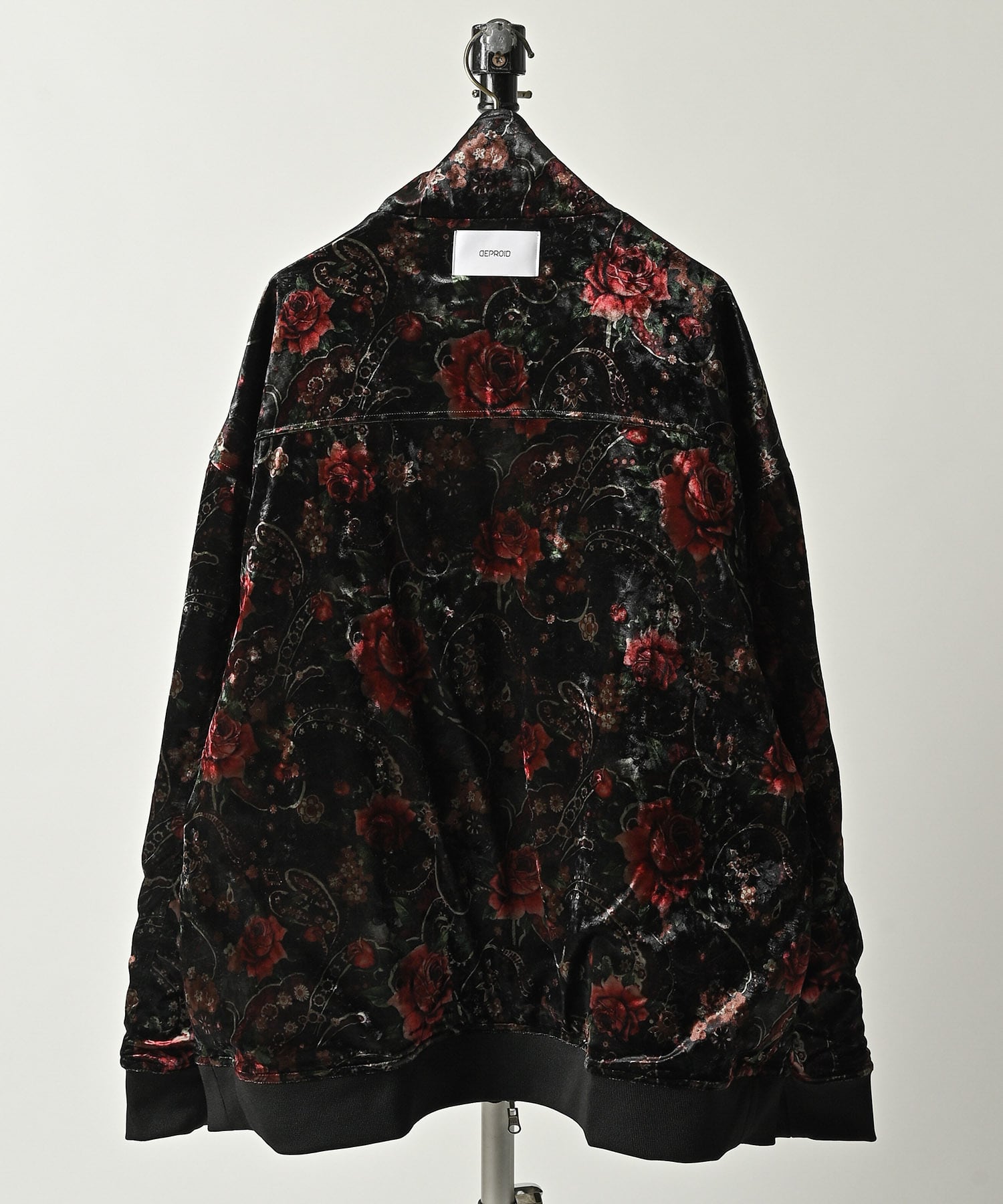 表側はしっかりとしたハリと美しい光沢が魅力で、綾織の生地表情がアクセントとなります。一方、裏側は優しいベロア素材にバラモチーフの総柄ボタニカルプリントが施されており、レトロでモードな空気感を演出しています。
