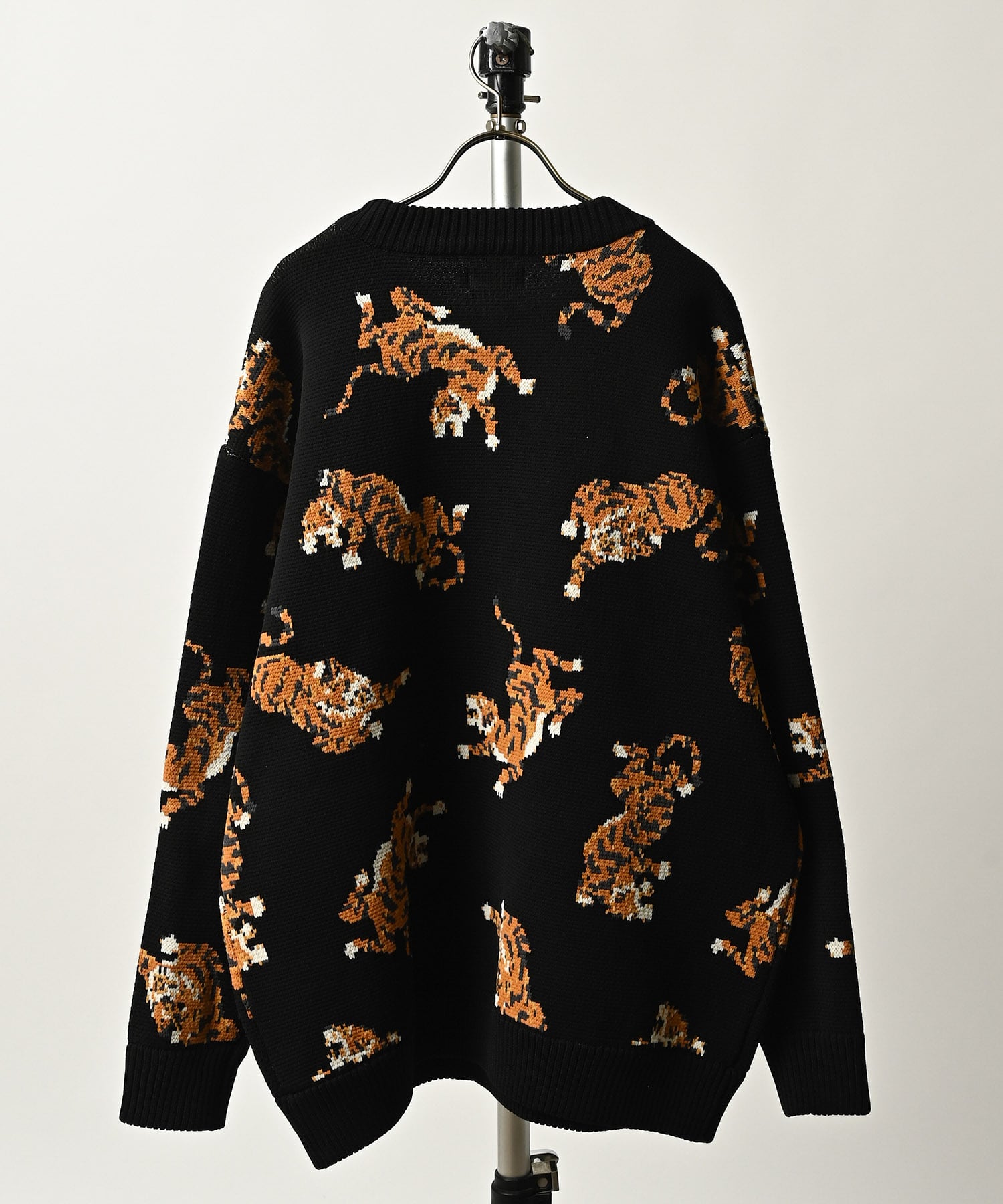 トラ柄を全面に編み込み、アートのような印象に仕上げました。ポリエステル特有の軽さとふくらみ感があり、着用時もストレスフリー。シーズンレスで活躍する万能ニットです。