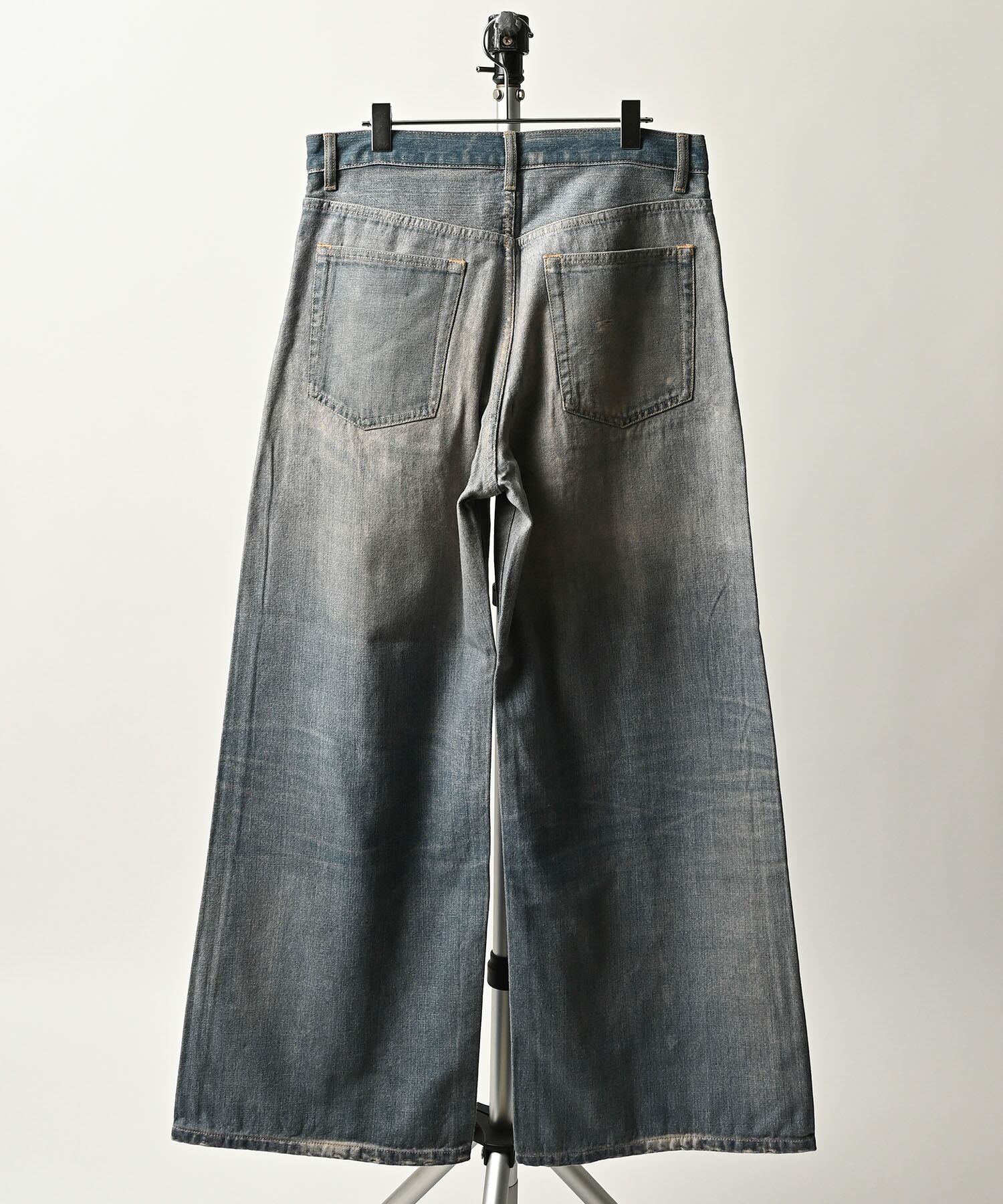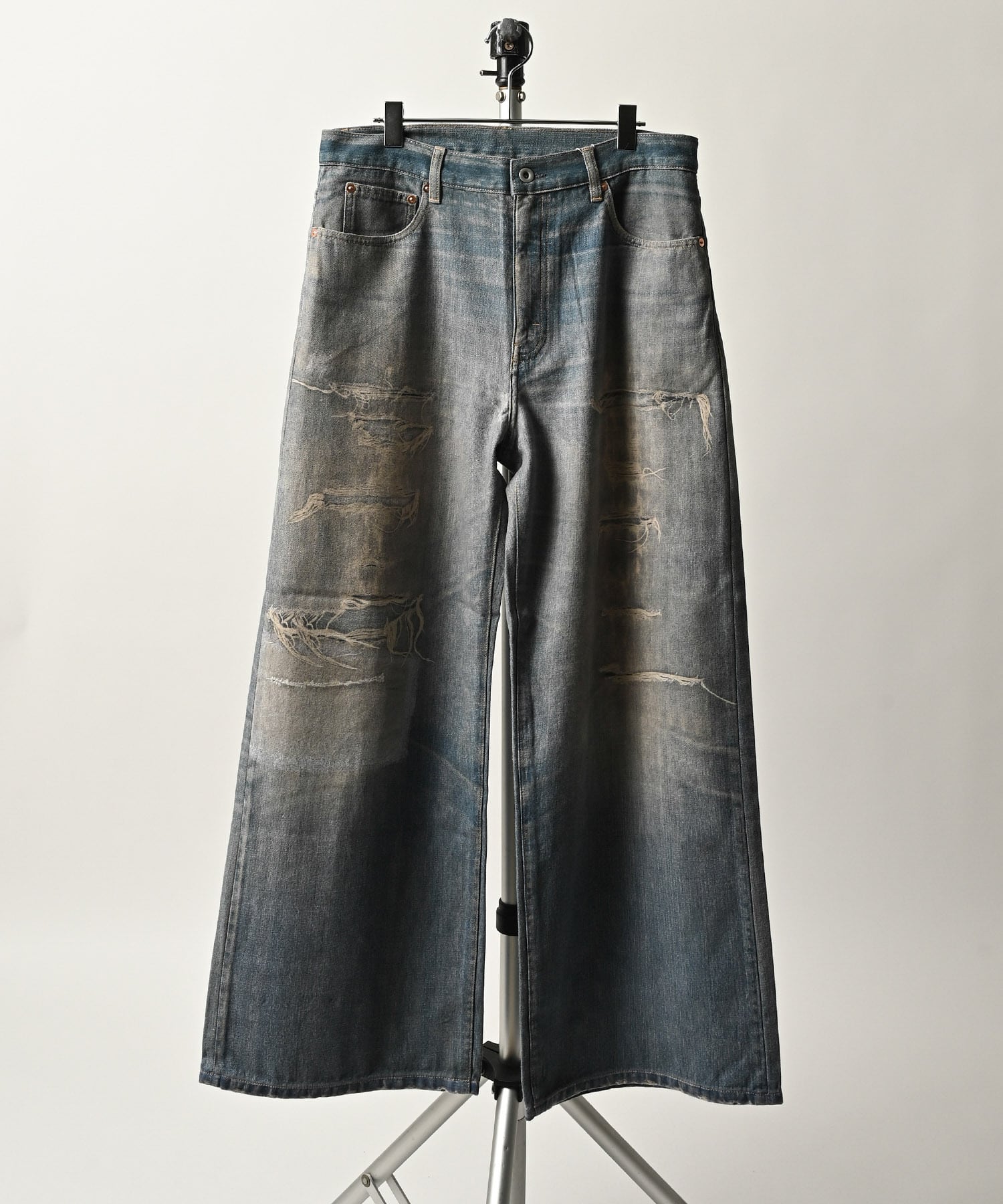 グラフィックプリントでダメージ加工、着古した感じのデニムを表現したパンツ。