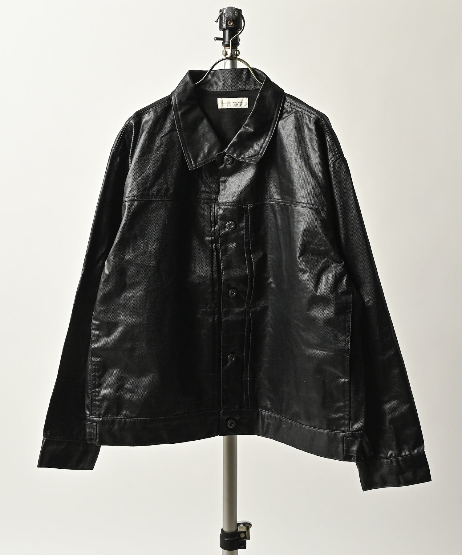 デニム生地にフロッキー加工やPUコーティングを施した生地を使用。レーヨン素材のフロッキー加工は光沢もありスエードのような肌当たりがあります。ポリウレタンコーティング加工はレザーのような質感になります。