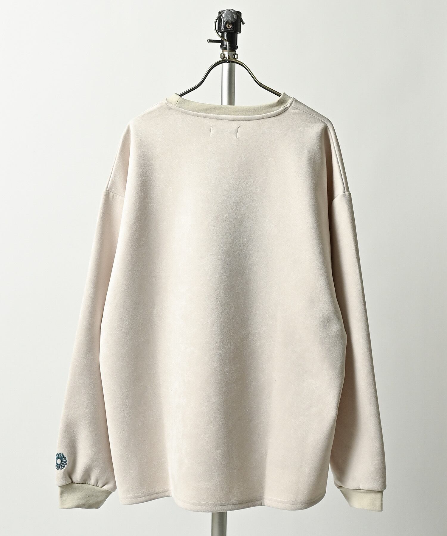 表面には微起毛のフェイクスウェード素材を使用。なめらかでマットな質感が、カジュアルになりがちなクルーネックを落ち着いた印象に仕上げています。