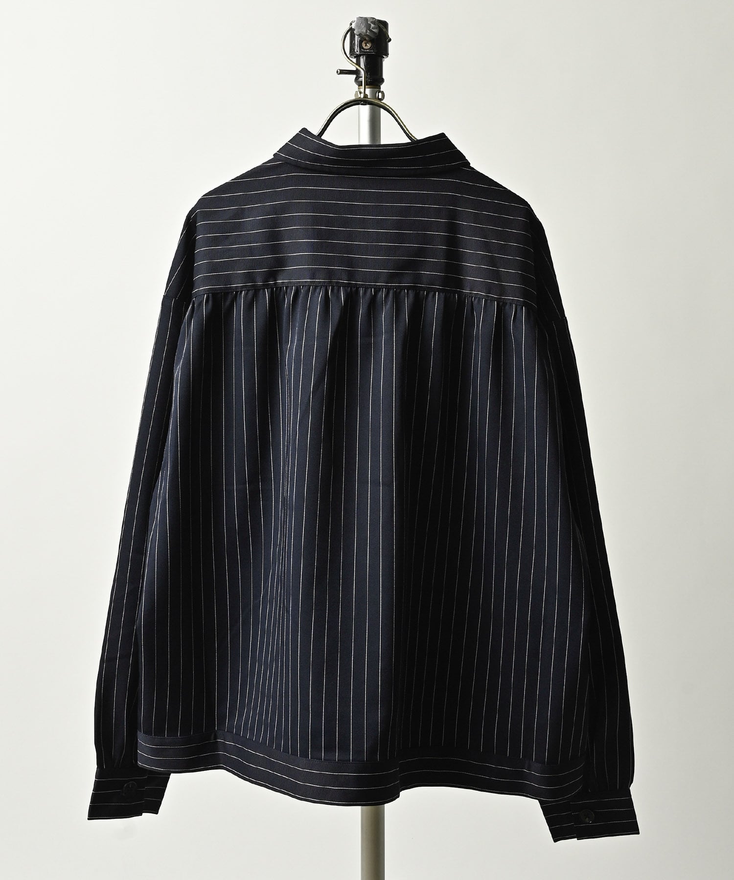 クラシックなピンストライプ素材を、ATELANEらしいリラックス感のあるシルエットに落とし込んだギャザージャケット。