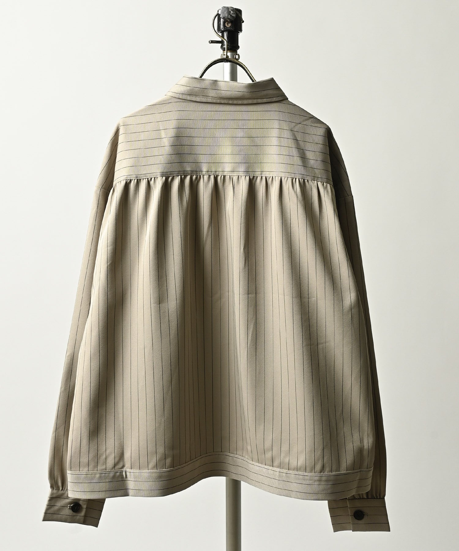 クラシックなピンストライプ素材を、ATELANEらしいリラックス感のあるシルエットに落とし込んだギャザージャケット。