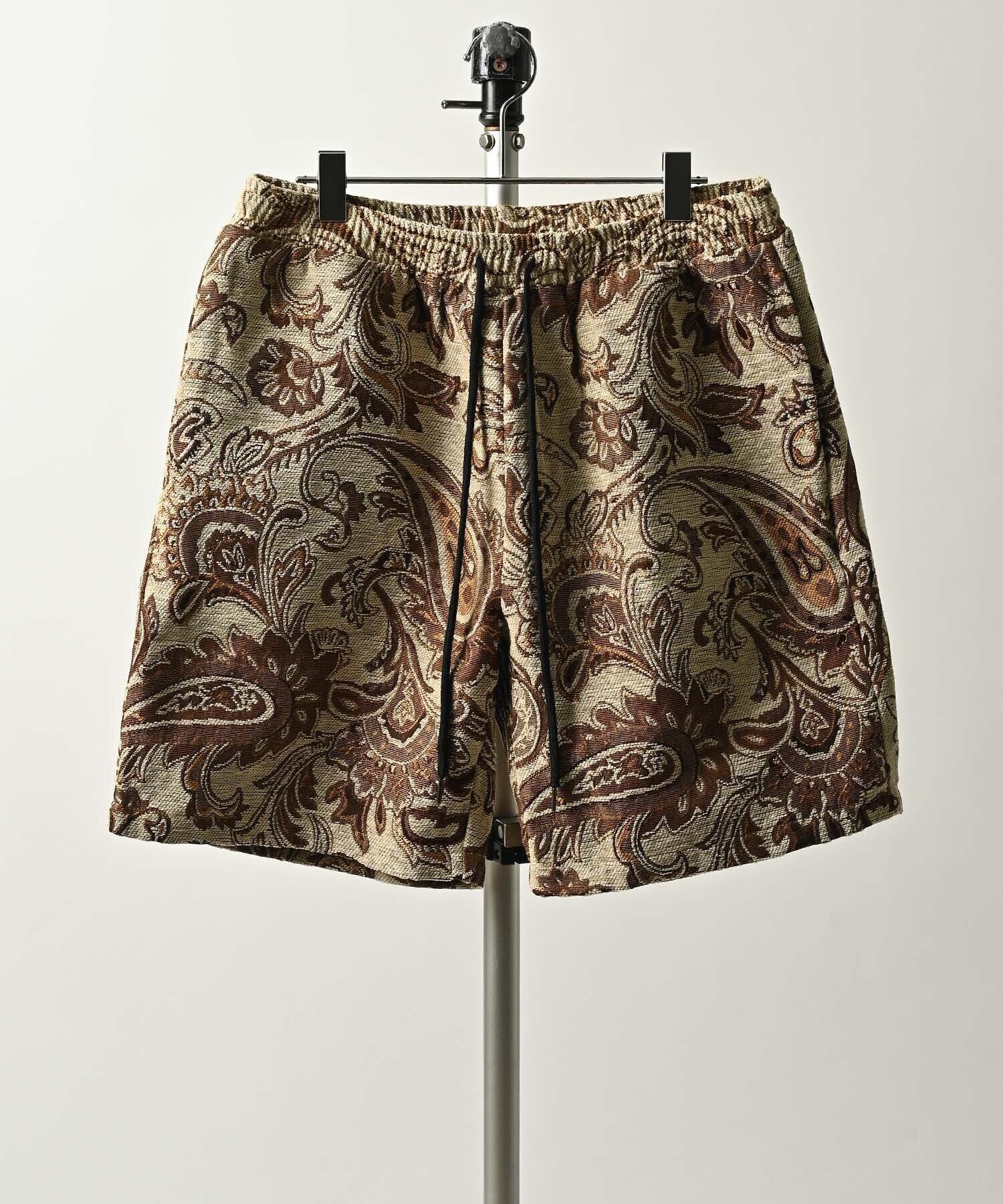 華やかなゴブラン織りのペイズリー柄が特徴的な、ショートパンツ。洗練されたデザインが印象を引き立て、スタイリッシュなコーディネートを実現します。ポリエステル100%の素材は、軽やかでストレスフリーな着心地を約束し、さまざまなシーンで活躍します。