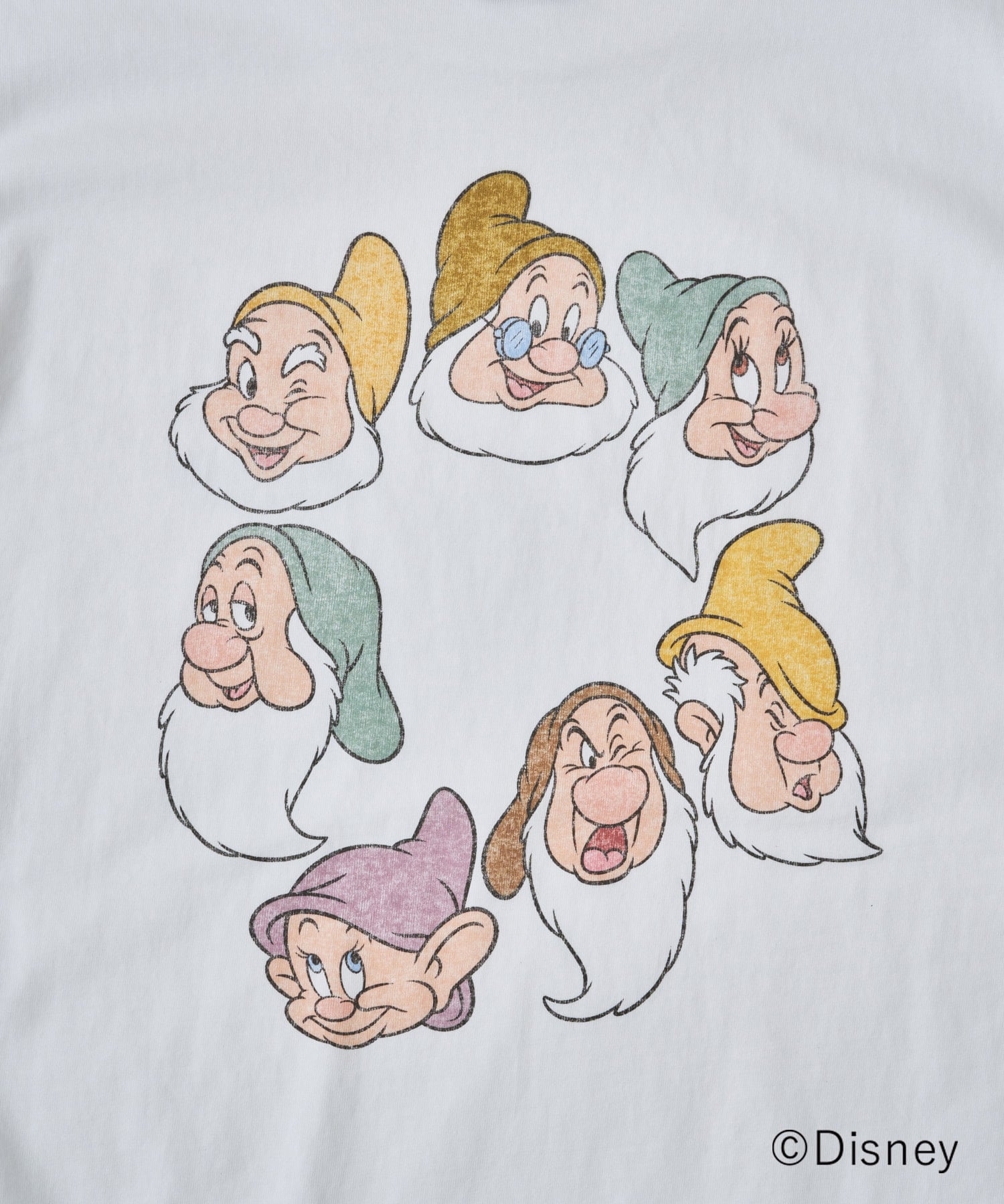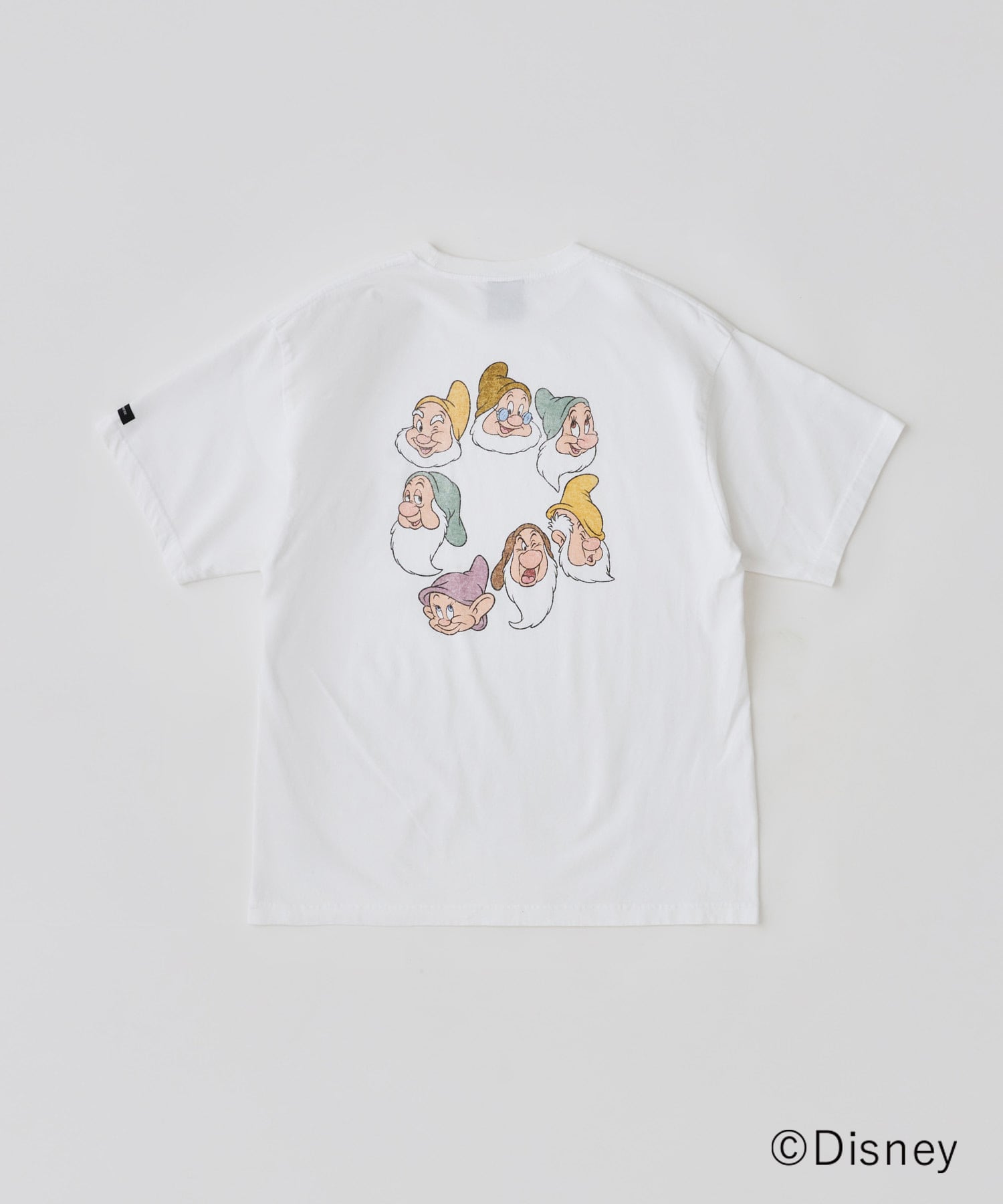 フロントには控えめなロゴを、バックには七人の小人の表情を円状にレイアウトしたサークルデザインを配置。