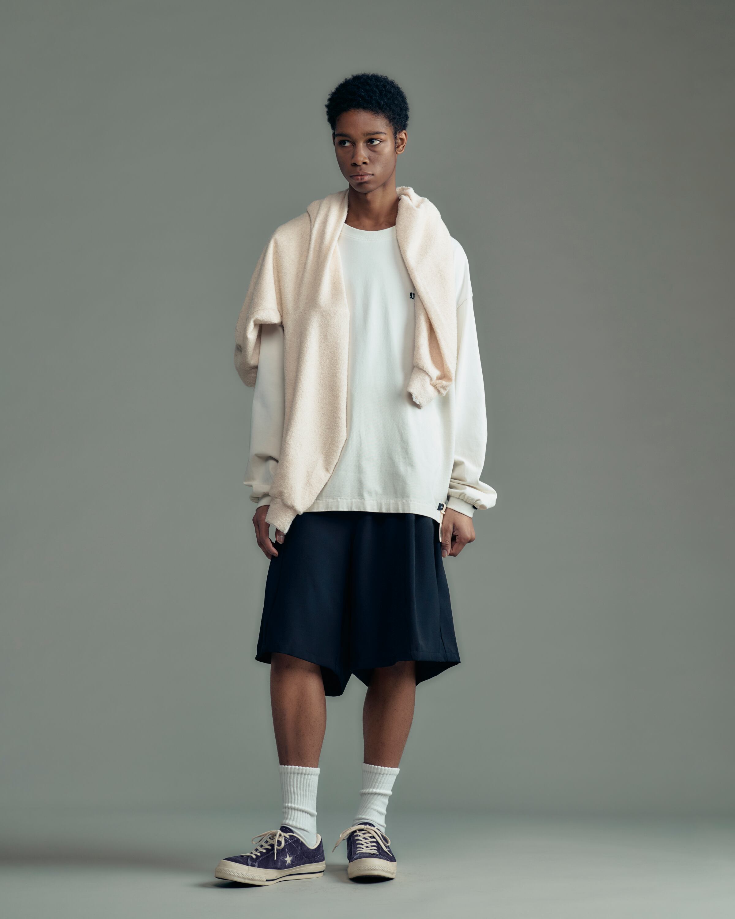 肩の落ち感と程よいゆとりがユニセックスで着られる現代的なバランスをつくり、幅広いスタイルに自然に馴染みます。