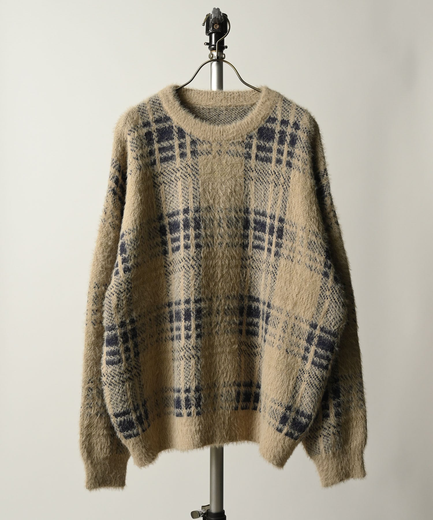 many men many mind Nylon shaggy check crew neck knit (BEG) M2321051
