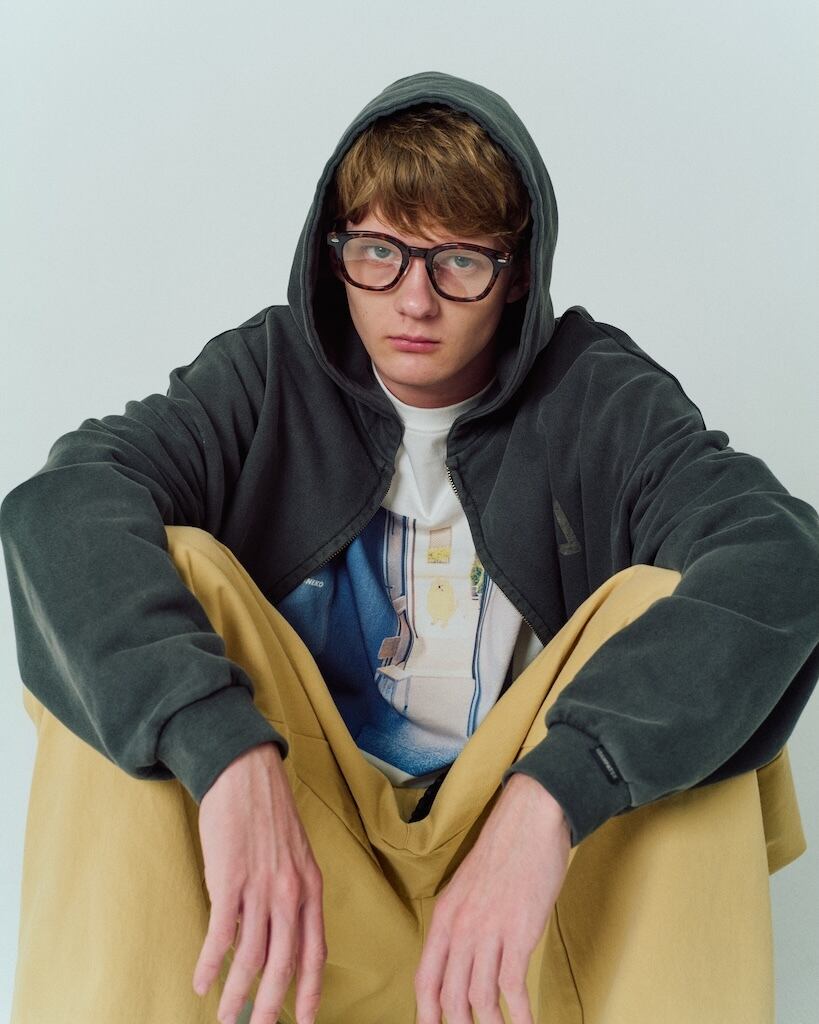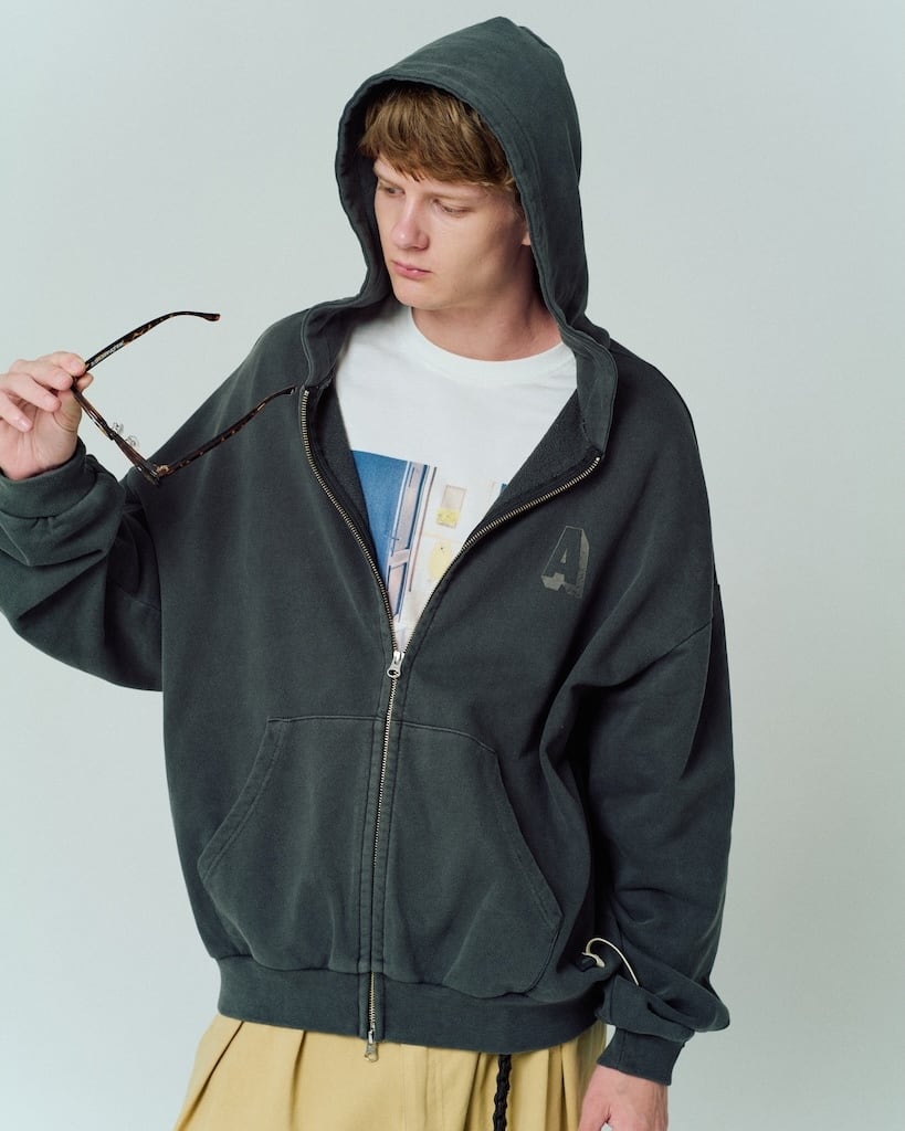 を使用した裏毛素材にピグメント加工を施したジップパーカー。